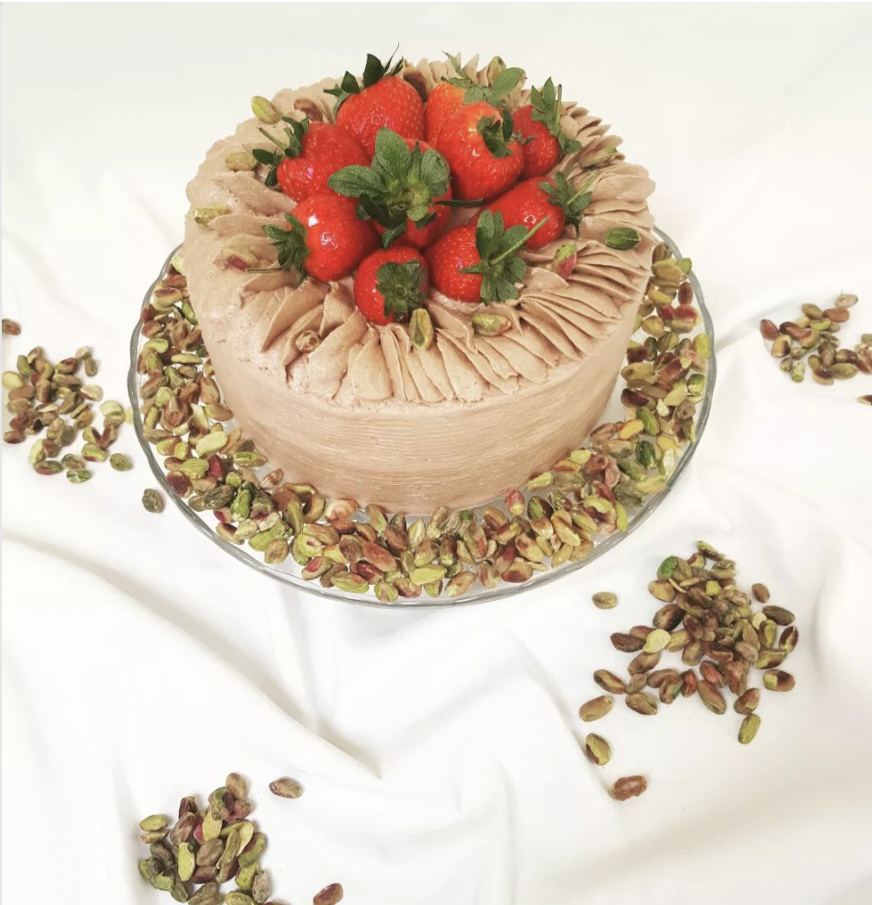 First up, a Pistachio, Chocolate and Strawberry Cake!“Native to the Middle East pistachio is known to be one of the oldest flowering nut tree. There are archeological evidence in Turkey, suggests that these nuts have been enjoyed as early as 7,000 BC! They flourished in hot climates and quickly spread from Middle East to Mediterranean. They soon became a delicacy for the upper society and explorers. Over centuries, pistachios has been used as dyeing agent, folk remedy for ailments ranging from toothache to sclerosis to the liver. With high nutritional value and long storage life, pistachios were treasured amongst the explorers and indispensable travellers item.